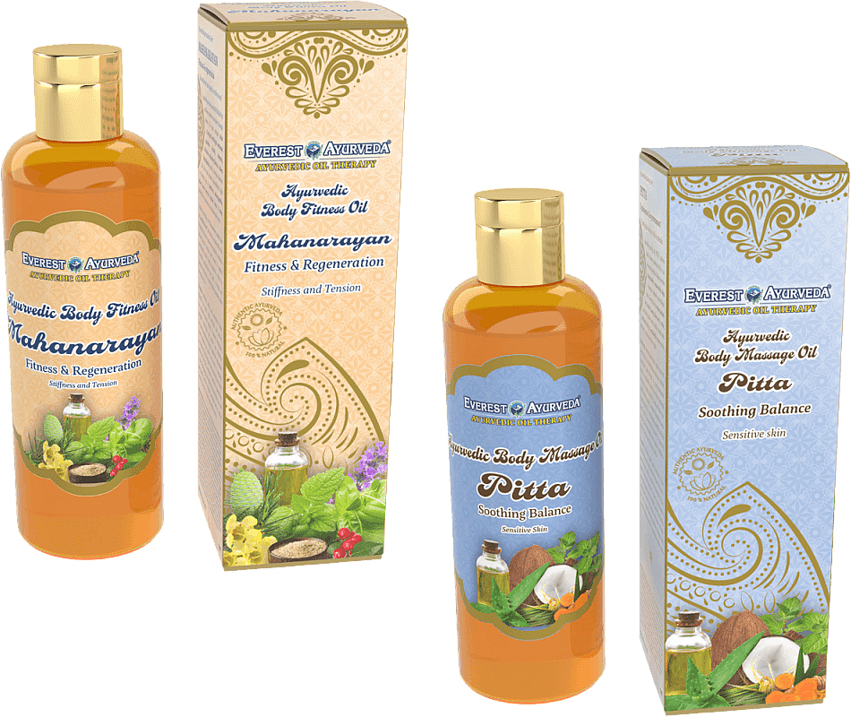 - Mahanarayan - výraznejší masážny olej obľúbený po športovej záťaži a pri stuhnutosti; masáž 5-10 min aspoň 3× týždenne (dlhodobejšie používanie). Nepoužívaj na tvár.