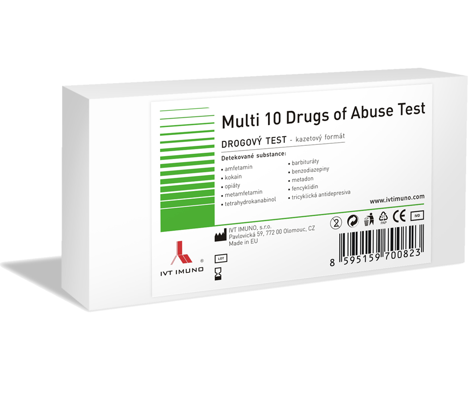 Tento test je vhodný ako pre použitie v ordinácii, tak doma. Spĺňa požiadavky medzinárodného štandardu na detekčné limity a patrí do kategórie testov POCT (point-of-care-testing). Z malého množstva moču dokáže určiť prítomnosť návykových látok v tele človeka už za chvíľu. Ak máte teda podozrenie, že vaše dieťa užíva drogy, kúpte si drogový test Multi 10. Dokáže odhaliť prítomnosť amfetamínu, barbiturátov, benzodiazepínov, kokaínu, metadonu, metamfetamínu, morfínu, heroínu, opiátov, extázy, kanabinoidov ako marihuana, hašiš a tricyklických antidepresív v moči, a teda aj v organizme. Výsledok sa dozviete už za 3 až 5 minút. Vzorku moču si dokonca môžete uchovať, a to najviac 48 hodín, a otestovať ju v tomto čase. Ak sa na teste objavia dve čiarky pri názvoch drog, jedna pri kontrole C, druhá pri testovacej oblasti T, vzorka je negatívna. Ak by však bola v moči nejaká droga, na teste sa objaví jedna čiarka v kontrolnej často C, ale v testovacej časti T sa čiarka neobjaví. Na testovanie vám stačí len jedna jediná vzorka moču.